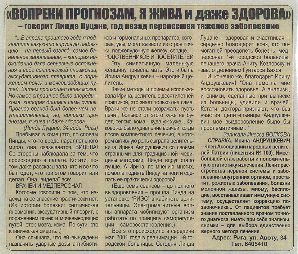 Сегодня Линда Луцане - здоровая и счастливая - сердечно благодарит всех, кто помогал ей преодолеть болезнь: медперсонал 1-й городской больницы, лечащего врача Аниту Козловску и зав. отделением Гунтарса Бахса. И, конечно же, благодарит Ирину Андрушкевич! "Она помогла мне восстановить здоровье. А анализы, и снимки, сделанные при выписке из больницы, удивили и врачей. Кстати, доктора признают, что без участия целительницы Андрушкевич мое выздоровление было бы проблематичным..."